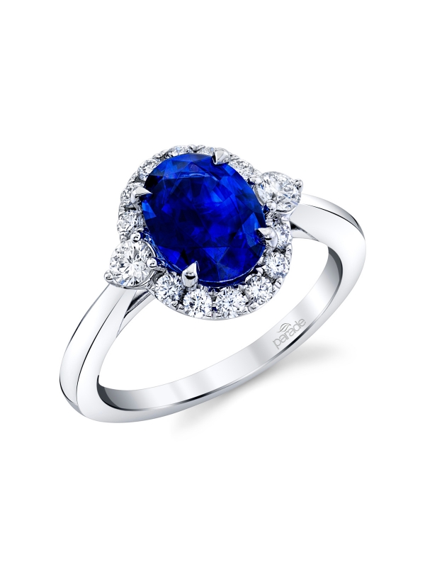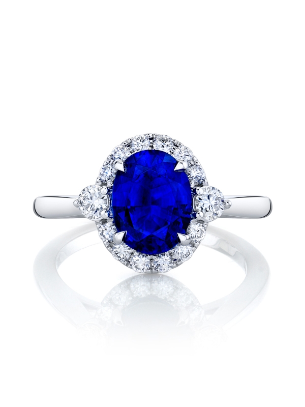 This polished design features a stylish halo, reimagined with a single larger round diamond on each side, and effortlessly complements the luxurious blue sapphire.