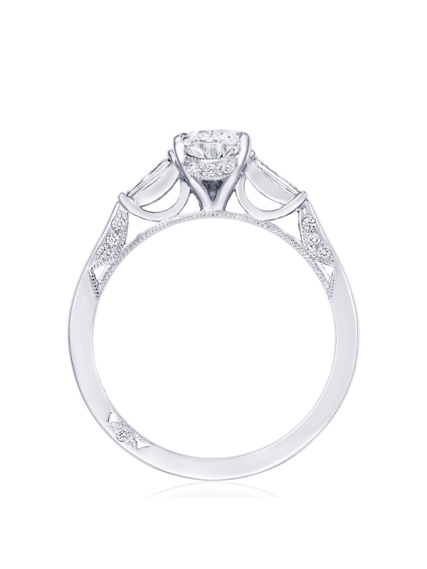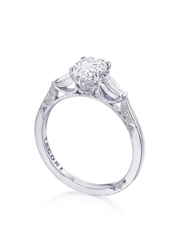 Let your diamond engagement ring stand out by contrasting your side stones with your center diamond Baguette side stones graduate to the pear shaped center, bringing a magical contrast to bring about beauty from every angle.