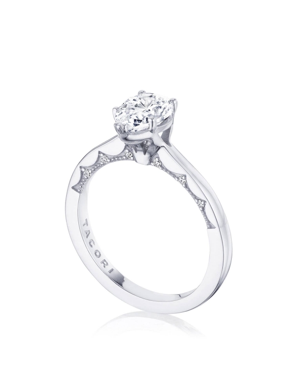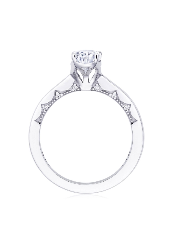 A high-polish ceiling is complemented by a Coastal Crescent fabric on the innerface, which boasts dainty pinpoint diamond detailing. The center stone rests on a metal-intense, geometric Cathedral Foundation.