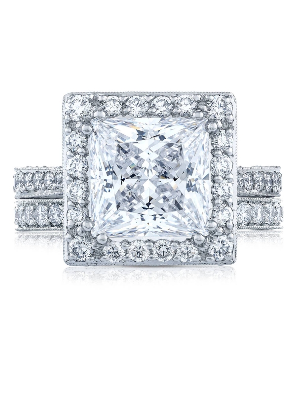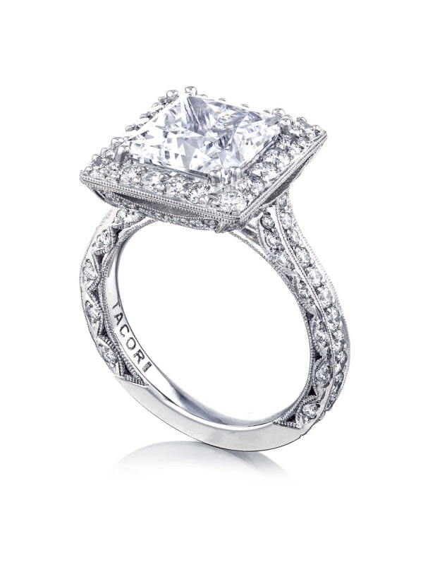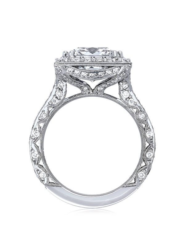 Round-brilliant diamonds embellish the ceiling and lead to the center stone, which is spotlighted with a bloom. A hidden bloom adds sparkle to the Cathedral foundation, while Classic Crescent fabric decorates the innerface of the band.