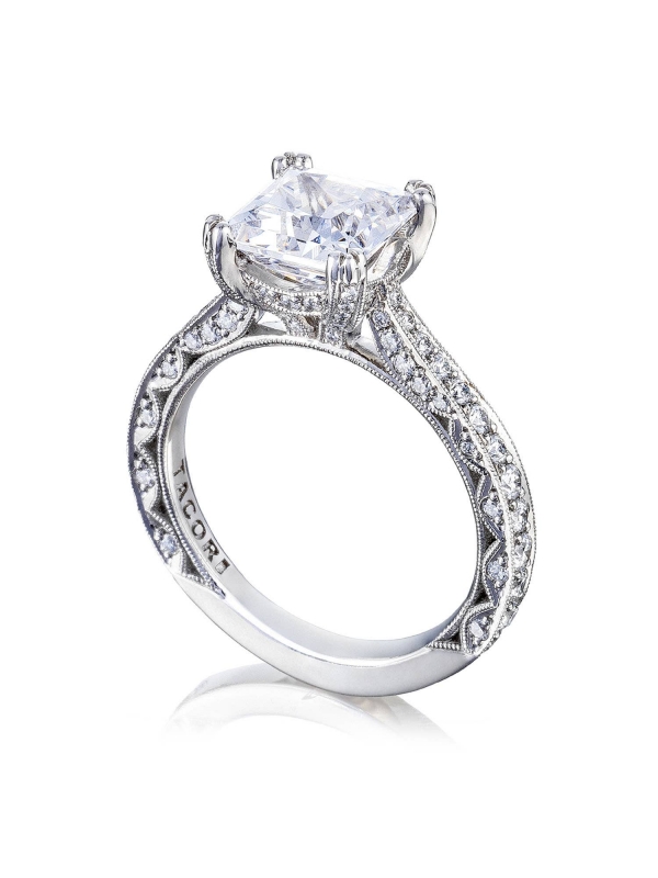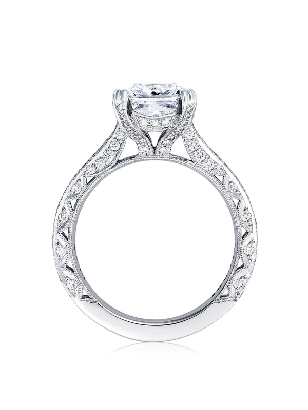 A delicate band of Classic Crescent fabric is Pav™-set with round-brilliant diamonds leading up the ceiling and adoring the crescents, while more diamonds embellish the prongs of the Cathedral foundation. A hidden bloom adds all-angle sparkle.