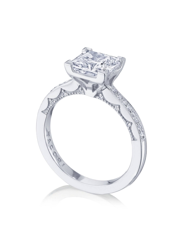 Round-brilliant diamonds decorate the ceiling of the dainty band, leading to the center stone, which appears to float on the Classic 360 foundation. Coastal Crescent fabric with pinpoint diamond detailing adds a clean texture to the innerface.