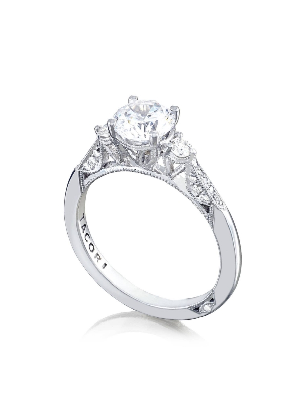 Simply stunning, simply Tacori. Your round center is brought to life by two high-intensity round side stones and diamond Pav™ detailing on the band.