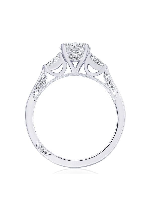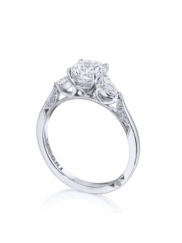 Let your diamond engagement ring stand out by contrasting your side stones with your center diamond Pear-shaped side stones graduate to the round center, bringing a magical contrast to bring about beauty from every angle.
