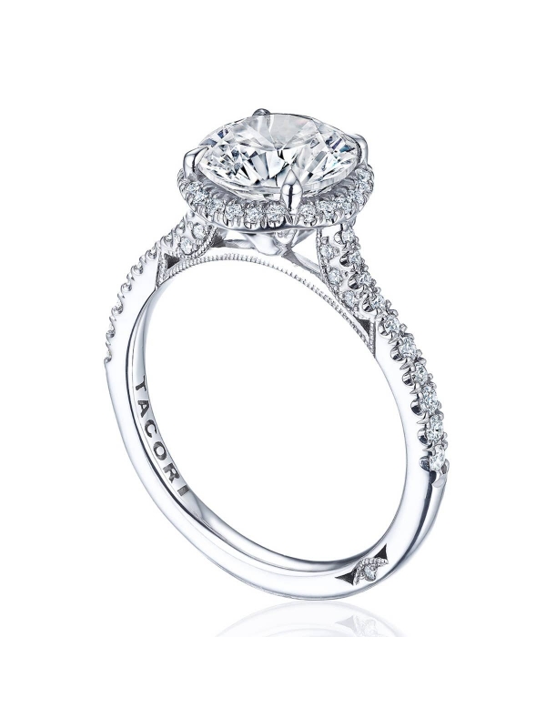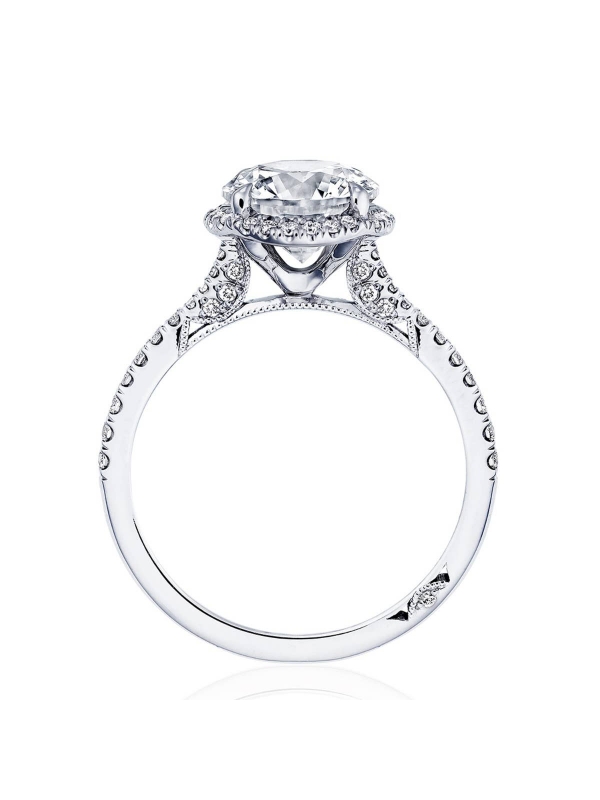 A thin, Simply Tacori Cathedral foundation that delivers brilliant detail, crowned with a round brilliant cut center and round shaped bloom. Truly Tacori and totally lovely.