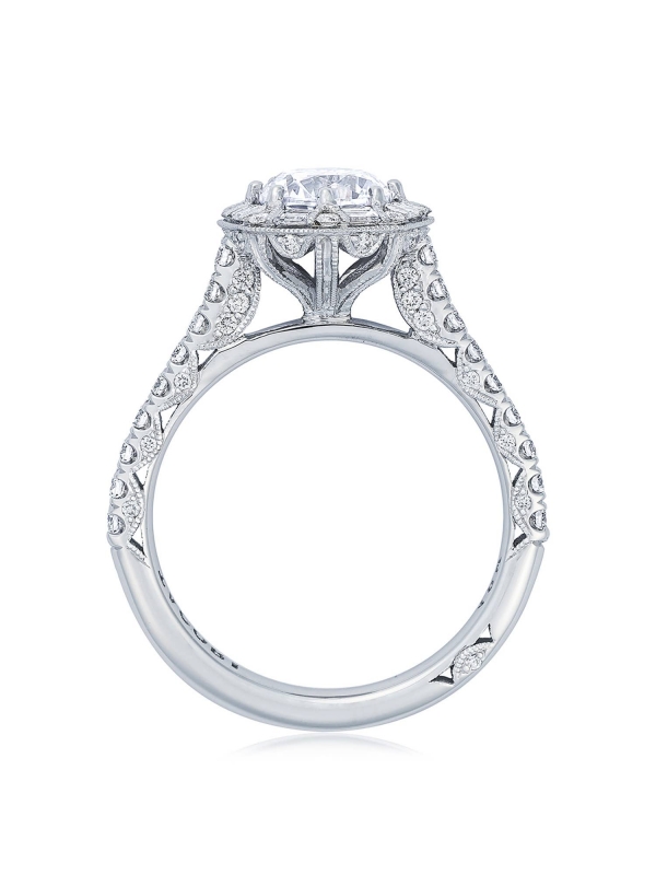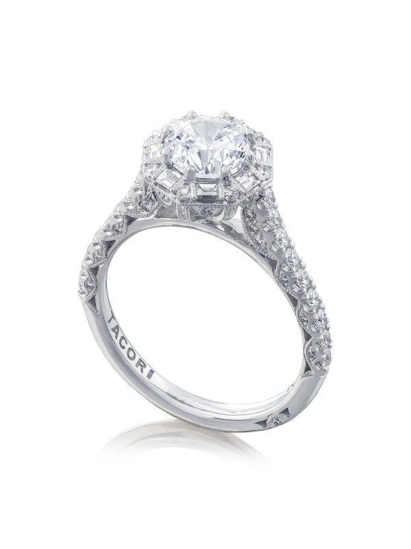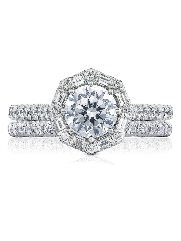 Pave-set diamonds run up the ceiling to the centerston, which is bloomed with baguette-shape diamonds. The crown sits on an intricate Cathedral foundation, while diamond-studded Petite Crescent fabric decorates the innerface.