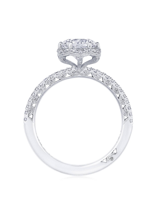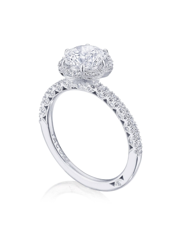 Pave-set diamonds decorate the ceiling, while a round bloom adds dimension to the center stone. The crown floats on a Classic 360 foundation above a band of Petite Crescent with more diamond details. A Signature Crescent marks the resting point.