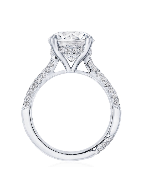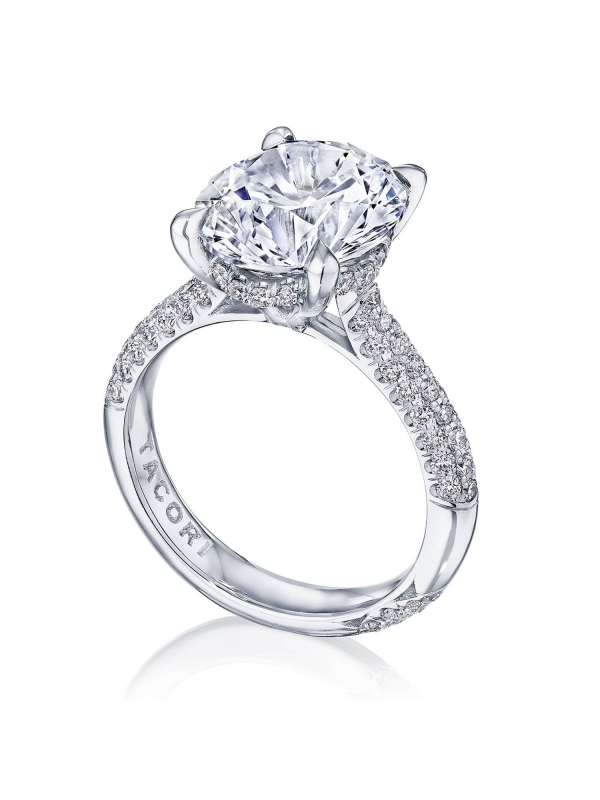 Triple Pav™ of decorates the ceiling, leading to a solitaire that sits atop a Cathedral foundation with a hidden bloom. A Founder's Crescent marks the foundation of the ring.