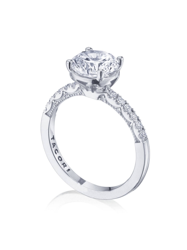 French Pav™-set diamonds on the ceiling lead to the solitaire, which rests on a metal-forward Classic 360 foundation. Coastal Crescent fabric with pinpoint diamond detailing decorates the innerface of the band.