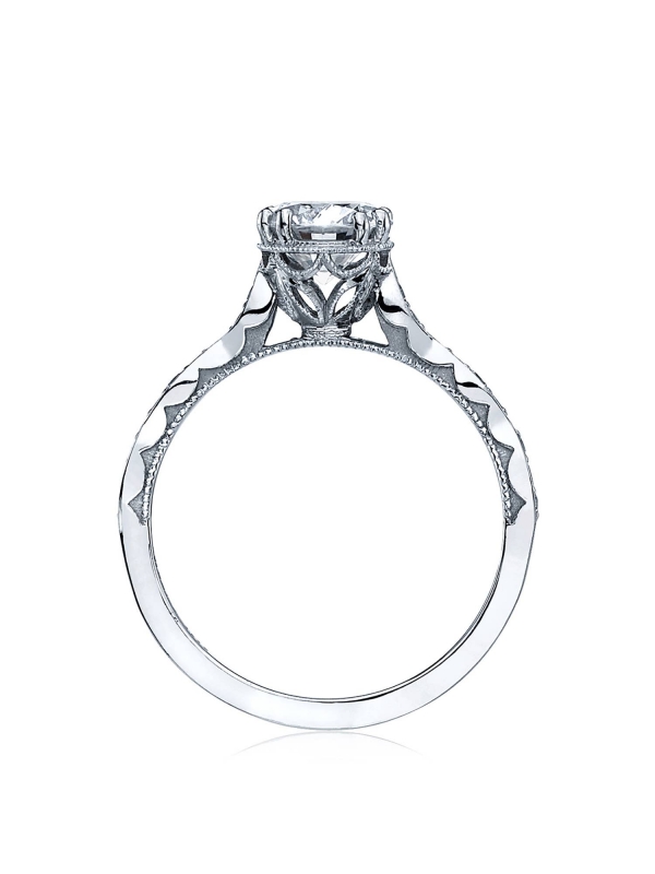 The inner face of this delicate and dainty engagement ring is detailed with the signature Tacori crescent design. The ceiling, scattered with diamonds creates a stunning foundation for the sparkling round center diamond.