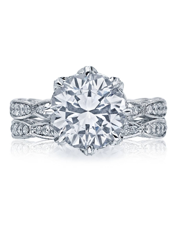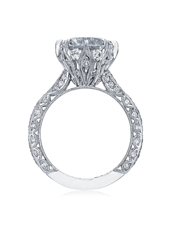 A twisting band creates marquise on the ceiling, which are filled with round-brilliant diamonds. The diamond-studded Classic Crescent fabric accents the innerface. The solitaire is lightly framed by the prongs of an intricate Cathedral foundation.