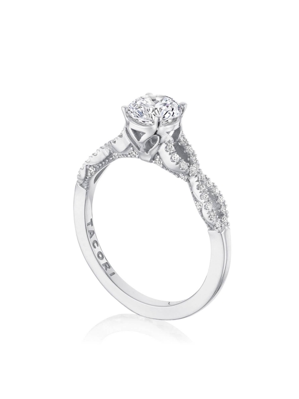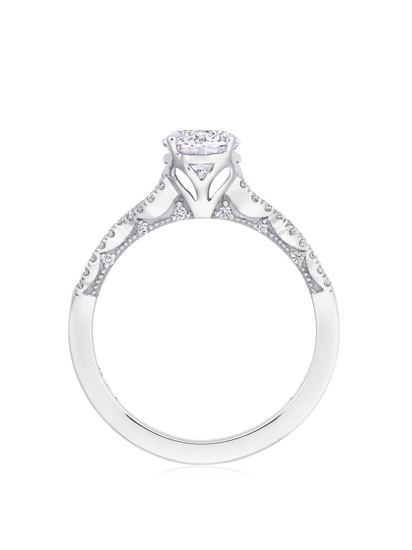 A twisting ceiling decorated with round-brilliant diamonds leads to the solitaire, which rests on a bold Cathedral foundation. Coastal Crescent fabric with pinpoint diamond detailing embellishes the innerface of the band.