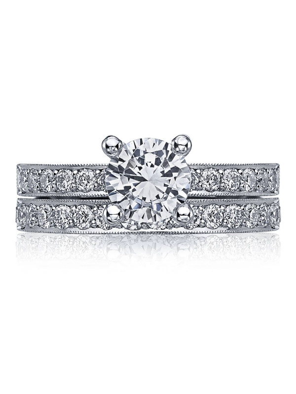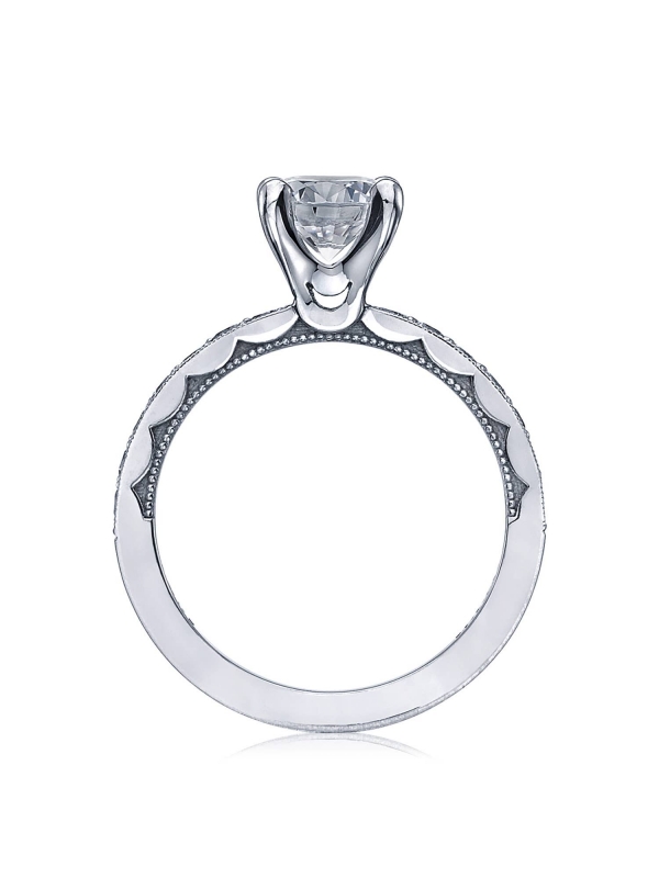 A string of diamond crescents decorate a romantic band with a hand set Pav™ ceiling for an incredibly beautiful engagement ring design.