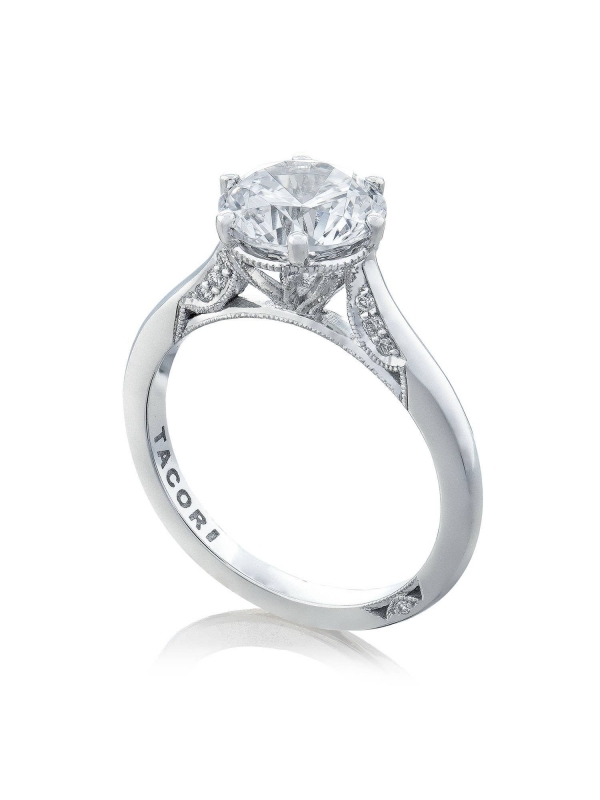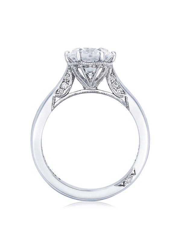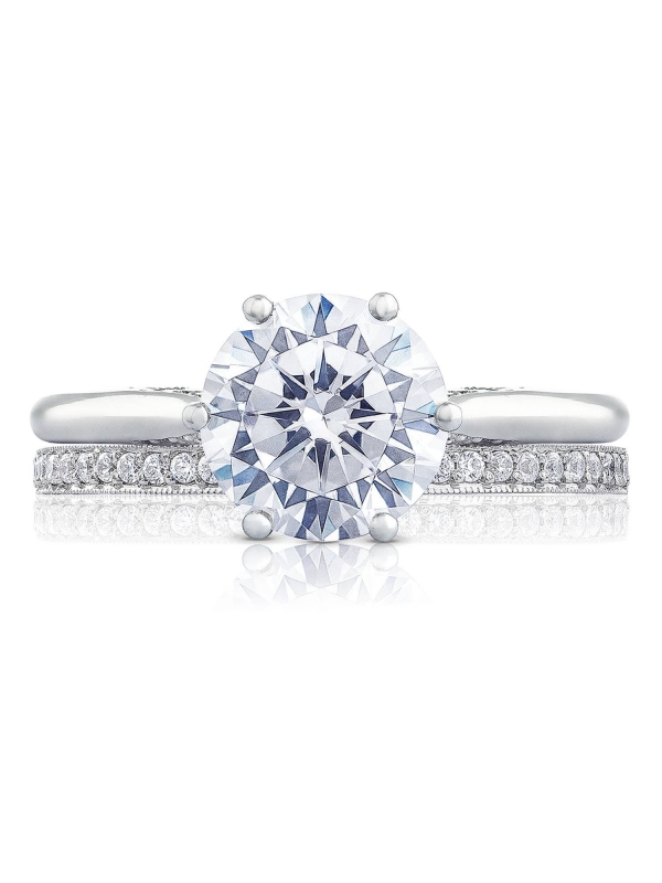 Let your brilliant round center shine in this timeless engagement ring. A sleek high polished ring with hidden diamond details along the inner face brings your round center to life.