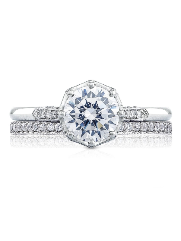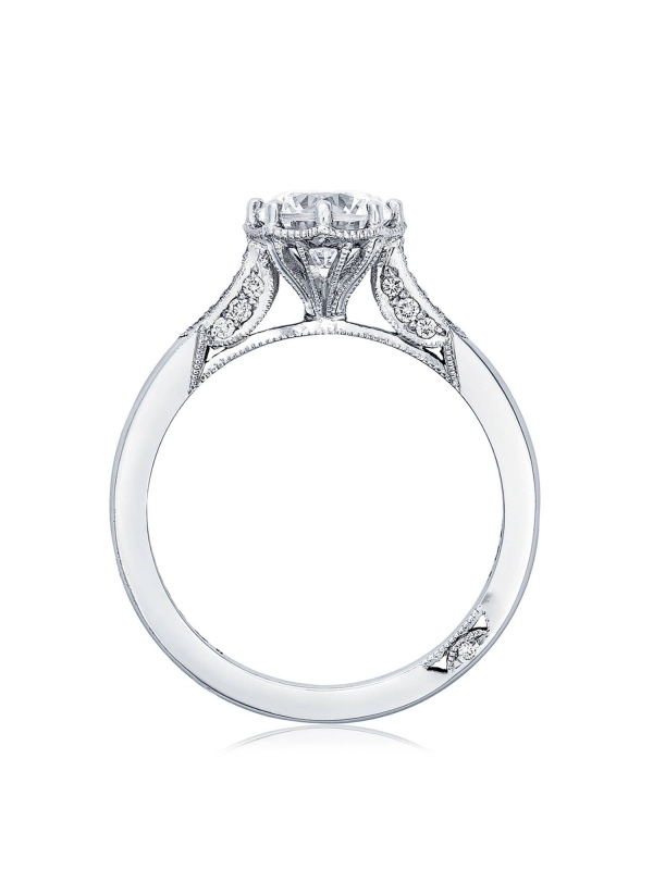 An engagement ring fit for the Tacori Queen. Featuring a renaissance crown, your round center sits on a regal throne for a ring that is worthy of your love story. Brilliant Pav™ diamonds dance along the ceiling of the high polished band with hidden diamond details along the inner face.