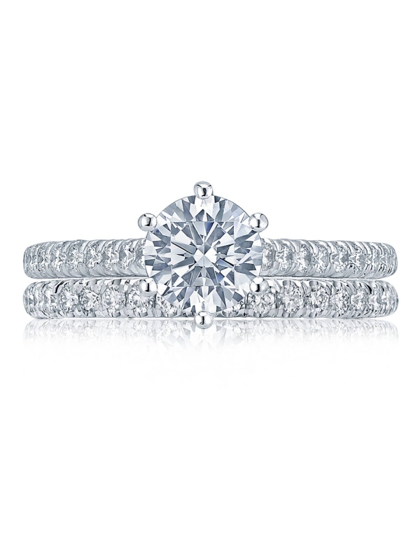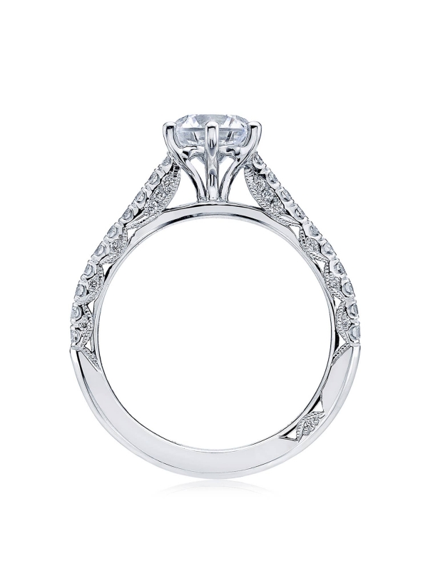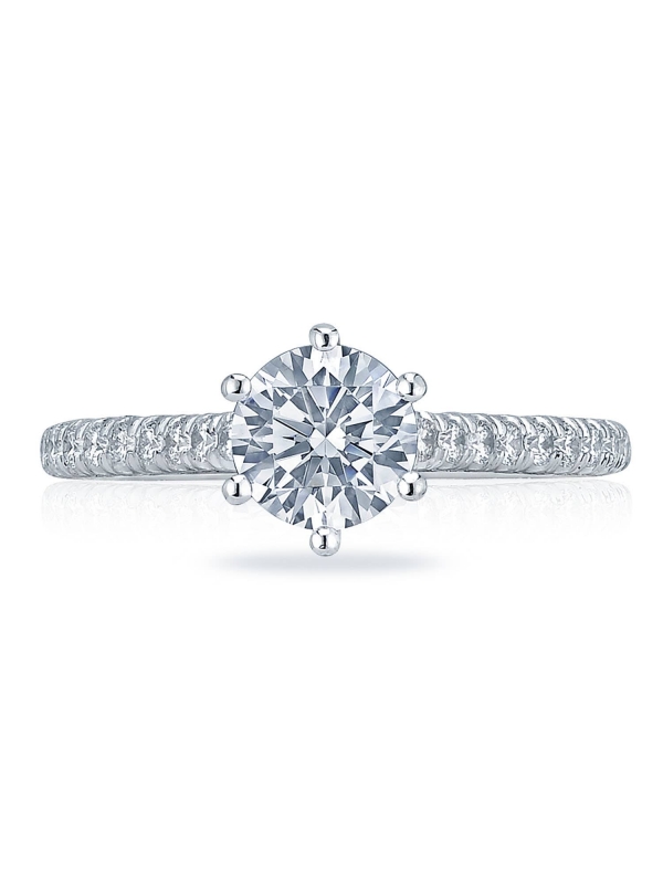 Six prongs hold the solitaire on a Cathedral foundation. A diamond-studded Petite Crescent fabric adds brilliance to the innerface, while Pav™ diamonds on the ceiling add sparkle to the arial view. A Signature Crescent marks the resting point.