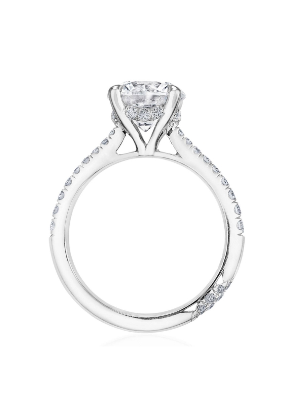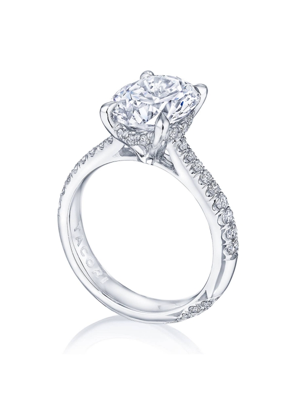 Round-brilliant diamonds add sparkle to the ceiling, while a Signature Crescent marks the resting point. The round-brilliant solitaire sits on a Cathedral foundation, decorated with a hidden bloom of diamonds for added brilliance.