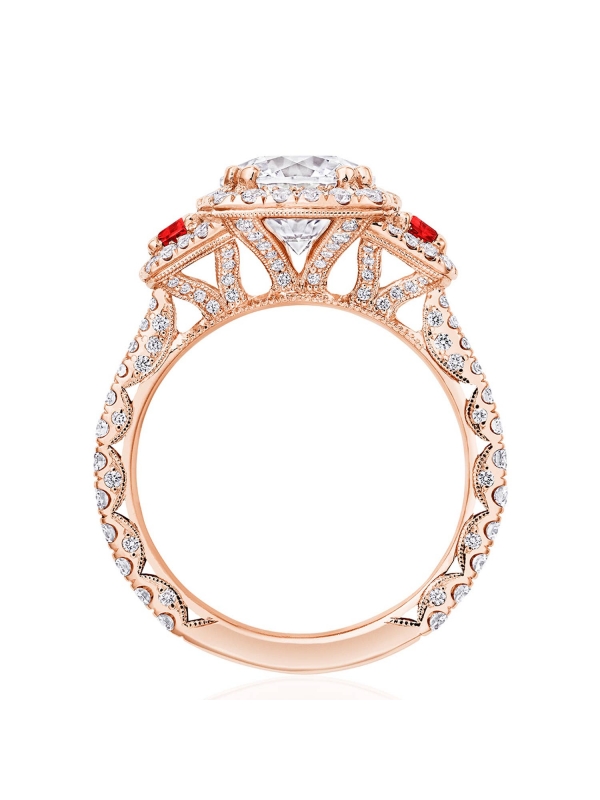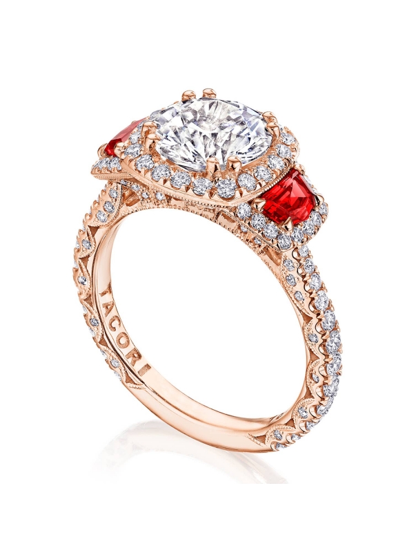 Bold and beautiful, this three-stone diamond engagement ring features a cushion shaped diamond spotlight and cadillac-cut sapphire side stones for an unforgettable stunner. 18kt Yellow Gold and 18kt Rose Gold are special order items.