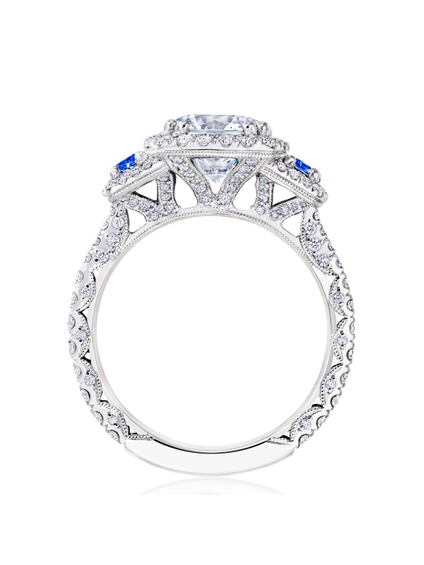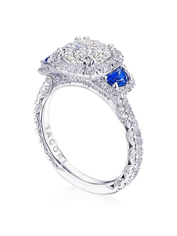 Bold and beautiful, this three-stone diamond engagement ring features a cushion-shaped diamond bloom and cadillac-cut sapphire side stones for an unforgettable stunner. 18kt Yellow Gold and 18kt Rose Gold are special order items.