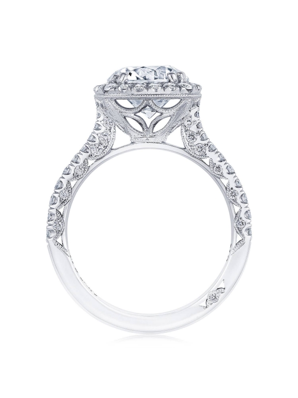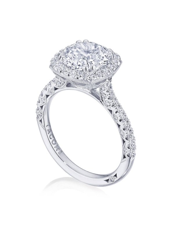 Pave diamonds decorate the ceiling, while a cushion bloom adds dimension to the center stone. The crown is set on a Cathedral foundation, above a band of Petite Crescent with more diamond detailing. A Signature Crescent marks the resting point.
