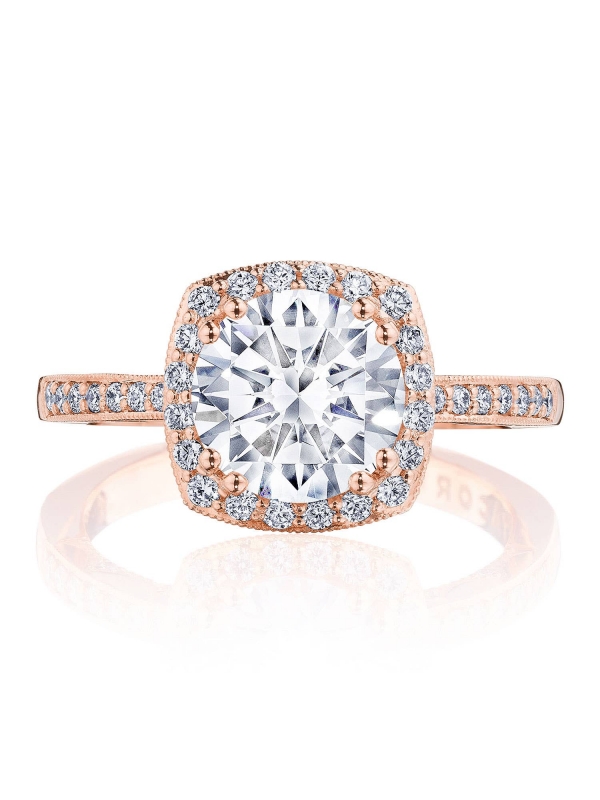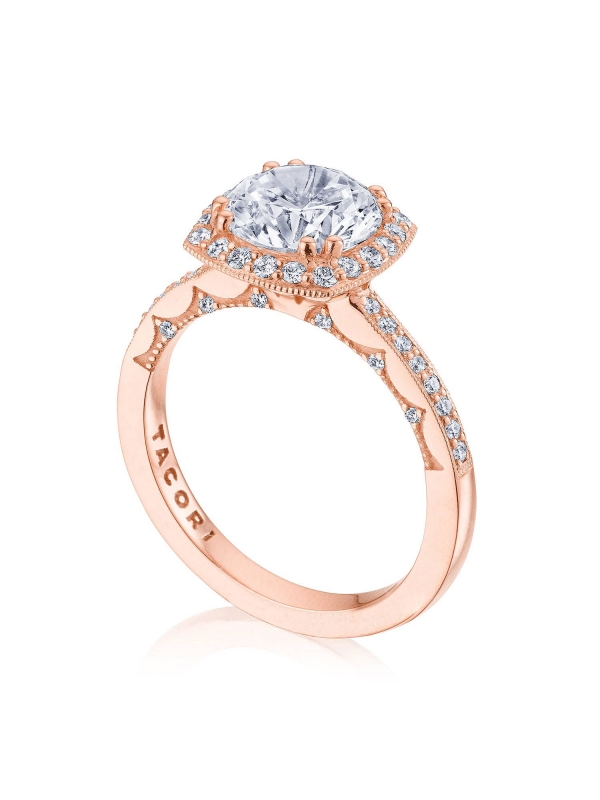 Round-brilliant diamonds decorate the ceiling and bloom around the center stone, for an even and ethereal sparkle. Coastal Crescent fabric with pinpoint diamond detailing adds a clean texture to the innerface.