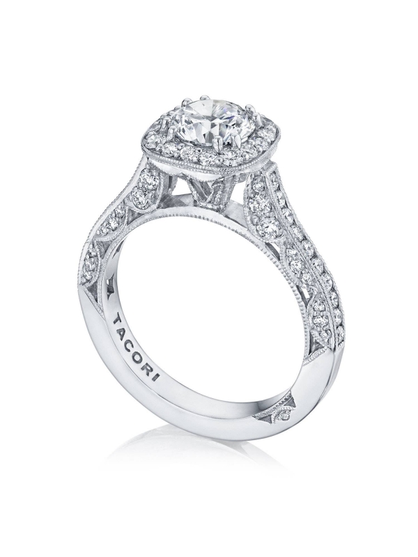 A romantic cushion bloom illuminates the center diamond, which is set into an open, milgrain-detailed Cathedral foundation. The band is Pav™-set with diamonds and decorated with an iconic, diamond-intense Classic Crescent fabric.